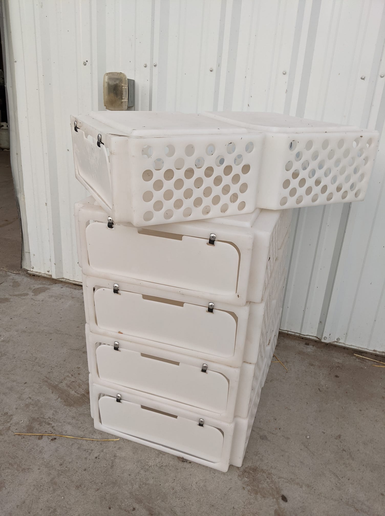 We designed a light weight; washable-durable gamebird transport crate. They interlock for convenient stacking. There is a strong “V” molded into the side for easy strap down.